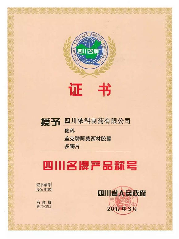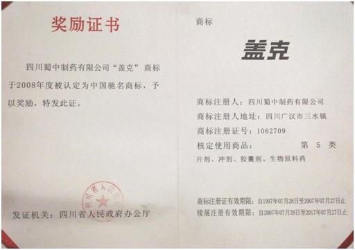 公司高度重视品牌战略,依法注册了“盖克”、“蜀中”、“三星堆”、“阿莫锋”、“益善源”、“蓉通”、“龙8唯一官方头号玩家”等108件注册商标,1999年“盖克”、2003年“蜀中”、2007年“三星堆”被认定为德阳市知名商标,2001年“盖克”、2004年“蜀中”被认定为四川省著名商标, 2008年“盖克”商标被国家工商行政管理总局认定为“中国驰名商标”。2017年3月,公司盖克牌、龙8唯一官方头号玩家牌阿莫西林胶囊和多酶片被四川省人民政府授予四川名牌产品称号。2016年,公司实现营业收入66373万元,利税7600万元;2017年,公司实现营业收入75045万元,利税7572万元。公司2017年被命名为德阳市第七批院士专家工作站,2016-2018连续三年被德阳市人民政府确定为重点龙头企业。